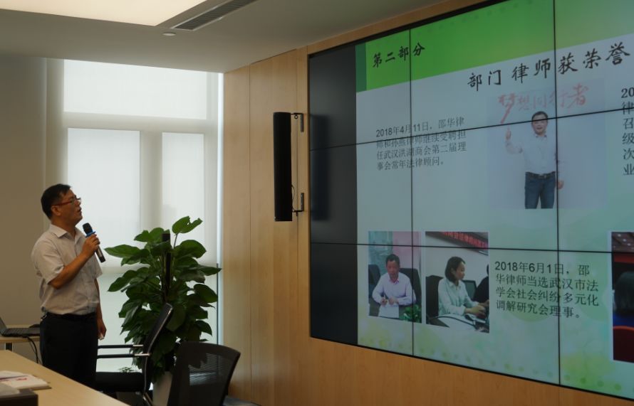 隨后,占傳德律師從基本情況、主要工作、工作計劃三個部分對2018年上半年工作進行了總結。以圖文并茂的方式詳細分析了部門人員情況及業(yè)務業(yè)績情況,他對部門所取得的成績表示肯定,對積極參與內外活動的律師提出表揚,對個人律師獲得的榮譽表示祝賀。