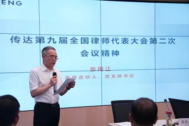 立豐所高級合伙人、黨支部書記張用江傳達第九屆全國律師代表大會第二次會議精神。