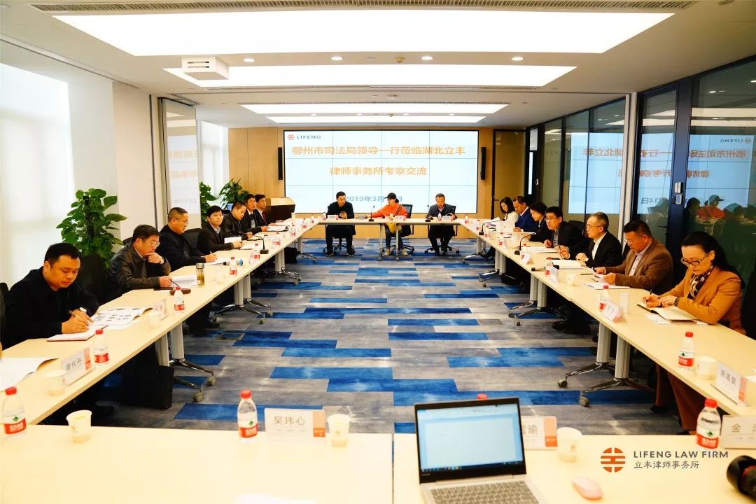 2019年3月14日上午,鄂州市司法局黨組成員、副局長、市律師行業(yè)黨委書記李建文帶隊(duì),鄂州市委組織部、市委社會組織工委、市司法局、市律師行業(yè)黨委、律師事務(wù)所黨支部等單位有關(guān)負(fù)責(zé)同志一行到湖北立豐律師事務(wù)所(以下簡稱“立豐所”)調(diào)研律師黨建工作。武漢市司法局律管處處長李崢,市律師協(xié)會秘書長黃有鴻等陪同調(diào)研。