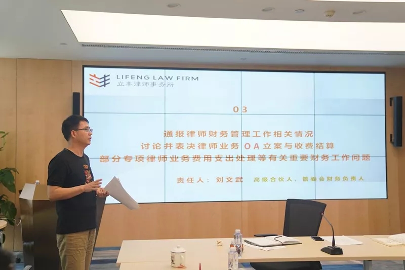 立豐所權(quán)益合伙人、管委會(huì)副主任劉勛首先通報(bào)了立豐所人員情況。截止2019年7月10日,立豐所武漢總部的執(zhí)業(yè)律師、實(shí)習(xí)律師、律師助理以及行輔人員已達(dá)到207人。隨后,參會(huì)權(quán)益合伙人討論并完善了《湖北立豐律師事務(wù)所人事管理制度》,對(duì)立豐所各類律師人員準(zhǔn)入所標(biāo)準(zhǔn)、辦公座位分配管理標(biāo)準(zhǔn)、人才培養(yǎng)制度等具體事項(xiàng)予以進(jìn)一步明確。還討論并表決通過(guò)了律所3名年輕律師加入普通合伙人的申請(qǐng)。