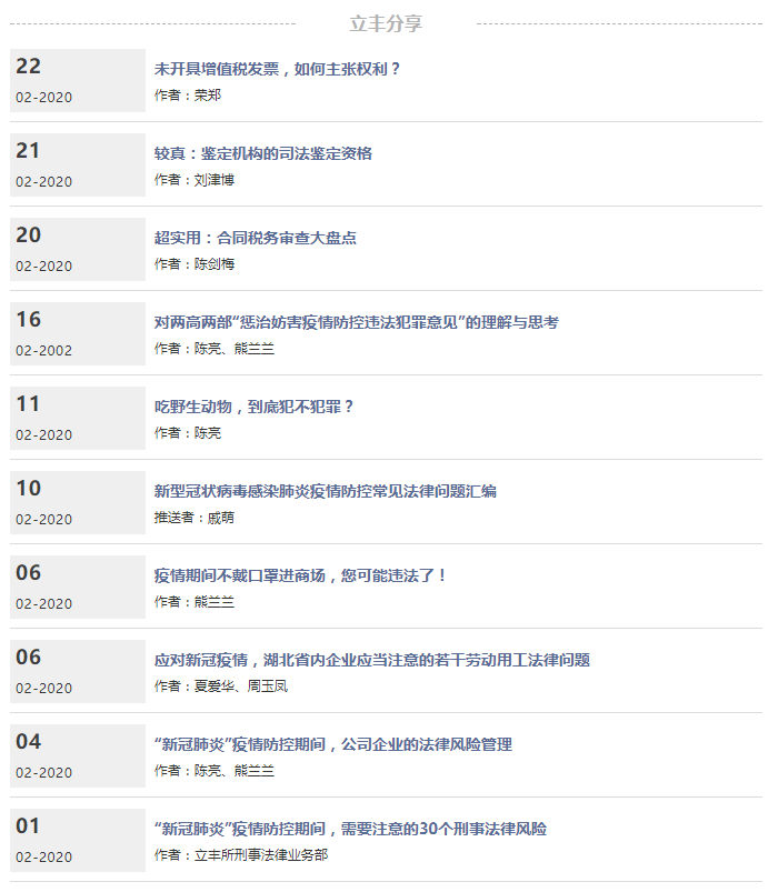 此外,針對(duì)疫情防控可能導(dǎo)致諸多法律風(fēng)險(xiǎn)問(wèn)題,立豐律師開(kāi)始網(wǎng)上辦公,為廣大人民群眾提供線(xiàn)上法律服務(wù),并自發(fā)就相關(guān)法律問(wèn)題進(jìn)行專(zhuān)題研究,接連撰文于立豐所公眾號(hào)上推出。