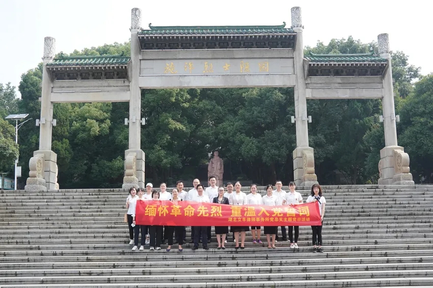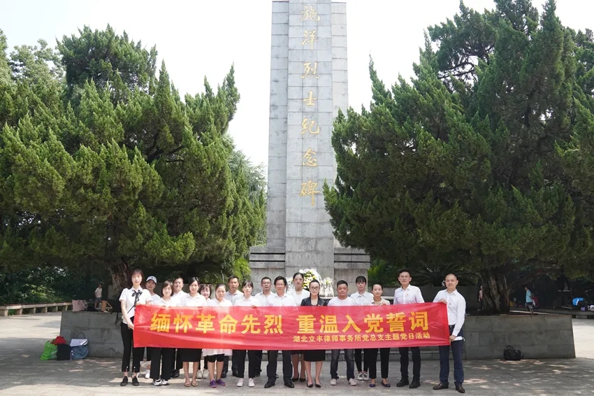 為慶祝中國共產(chǎn)黨建黨九十九周年,2020年7月1日,湖北立豐律師事務(wù)所黨總支在武漢施洋烈士陵園組織開展“緬懷革命先烈,重溫入黨誓詞”主題黨日活動(dòng)。本次活動(dòng)由立豐黨總支副書記汪后新同志帶隊(duì),黨總支委員易卉同志、聶義明同志、李黎同志、汪磊同志,黨員代表、預(yù)備黨員、入黨積極分子等共計(jì)20人參加活動(dòng)。