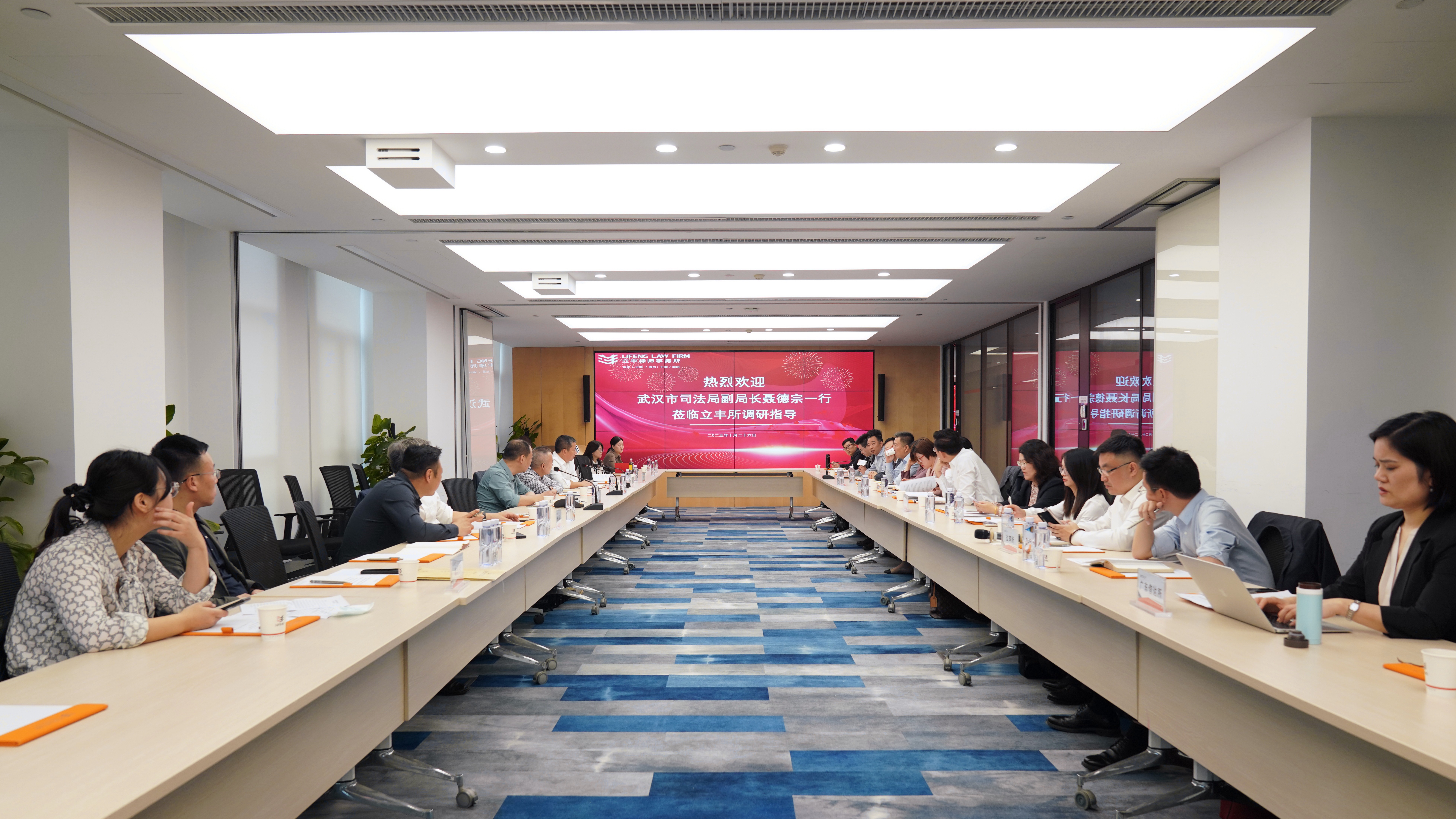 2023年10月27日上午,武漢市司法局黨委委員、副局長(zhǎng)、市律師行業(yè)黨委書記聶德宗一行在湖北立豐律師事務(wù)所對(duì)十家律所進(jìn)行調(diào)研座談,武漢市律師行業(yè)黨委委員、黨委辦公室負(fù)責(zé)人宋東輝,武漢市司法局律工處副處長(zhǎng)、市律師協(xié)會(huì)秘書處負(fù)責(zé)人陶長(zhǎng)玲,市律師協(xié)會(huì)副秘書長(zhǎng)金津陪同調(diào)研。