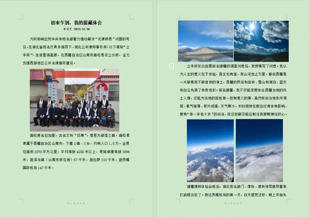 接著,王曉明同志給在座黨員同志讀了遠赴西藏曲松“援藏律師”李靈芝同志發(fā)送來的《初來乍到,我的援藏體會》,并將1624字的體會發(fā)至支部微信群共同學(xué)習(xí),向踏上雪域高原的援藏律師致敬,李靈芝同志相信自己定能不辱使命,擔(dān)負起立豐的信任與支持,努力克服高原環(huán)境挑戰(zhàn),為西藏建設(shè)做一些“實實在在的事情”,交上一份滿意的援藏答卷,用實際行動踐行“人民律師為人民的”精神。