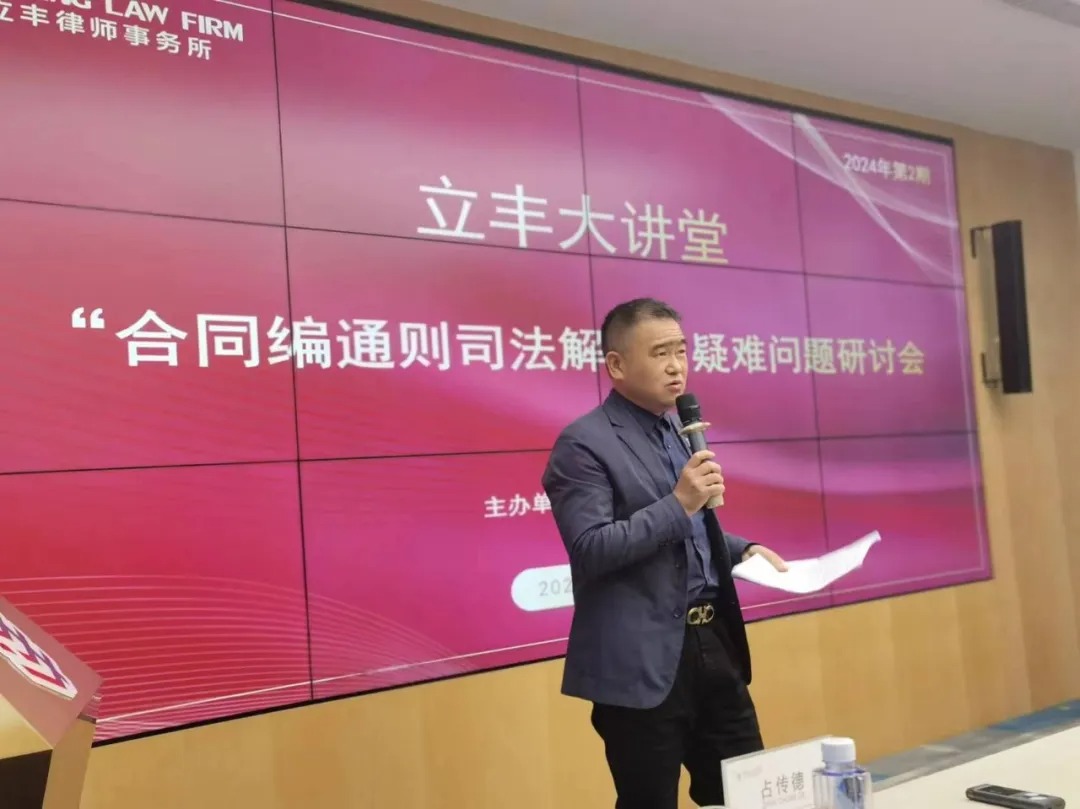 2024年4月19日下午,湖北立豐律師事務(wù)所研究院(以下簡(jiǎn)稱“立豐研究院”)在本所一號(hào)會(huì)議廳舉辦2024年度第二期“立豐大講堂”活動(dòng)。本期講堂的主題為“《民法典合同編通則司法解釋》疑難問題研討會(huì)”,北京中倫(武漢)律師事務(wù)所高級(jí)合伙人、一級(jí)律師張粒,湖北省律師協(xié)會(huì)建設(shè)工程與房地產(chǎn)專委會(huì)副主任、武漢城市建設(shè)集團(tuán)總法律顧問、首席合規(guī)官李芊,武漢市地鐵集團(tuán)的代表等多名特邀嘉賓及立豐所律師共七十余人參與了本次研討活動(dòng)。