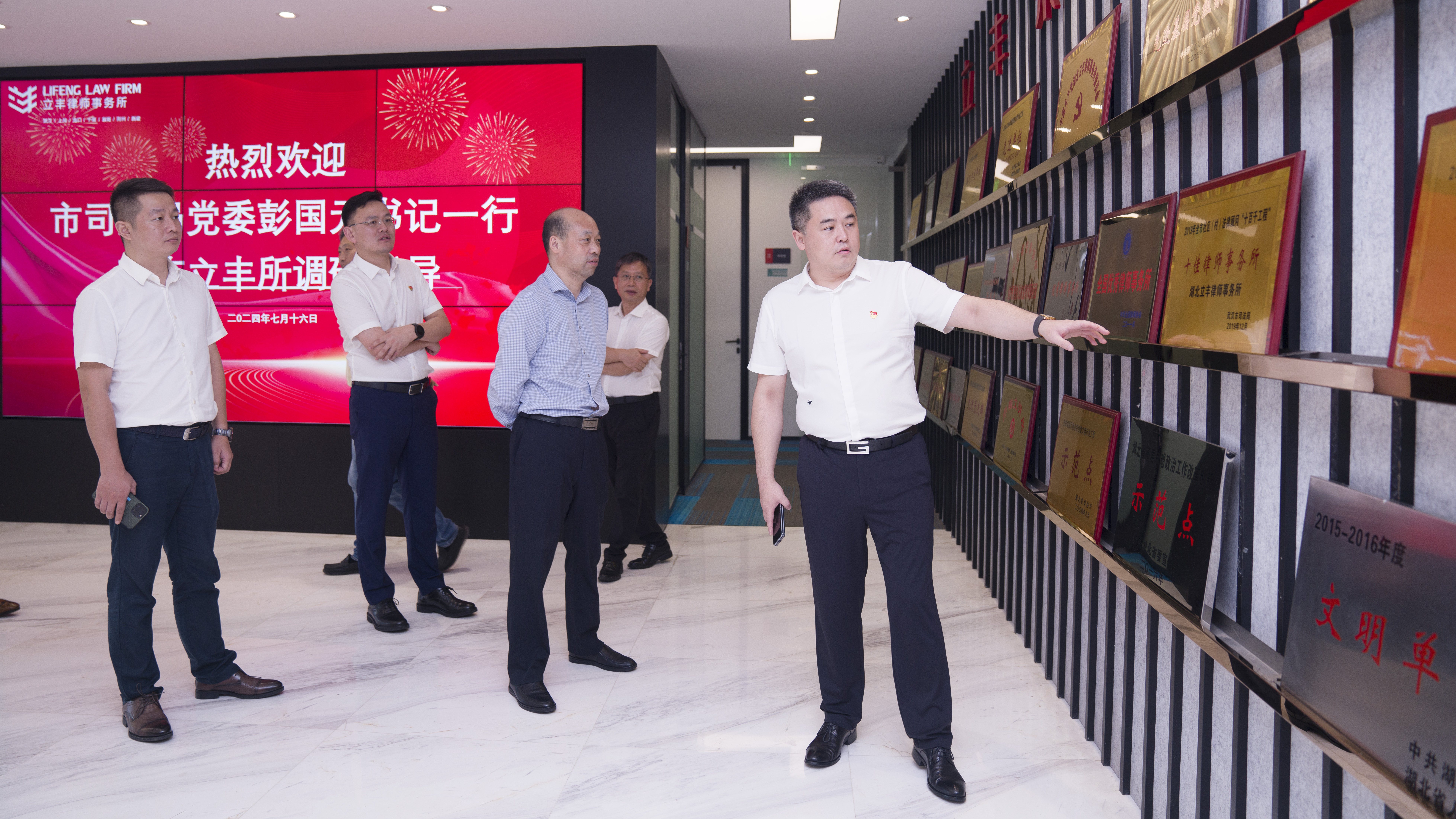 2024年7月16日下午,武漢市司法局黨委書記彭國元一行蒞臨湖北立豐律師事務所(以下簡稱“立豐所”)調(diào)研黨建工作。