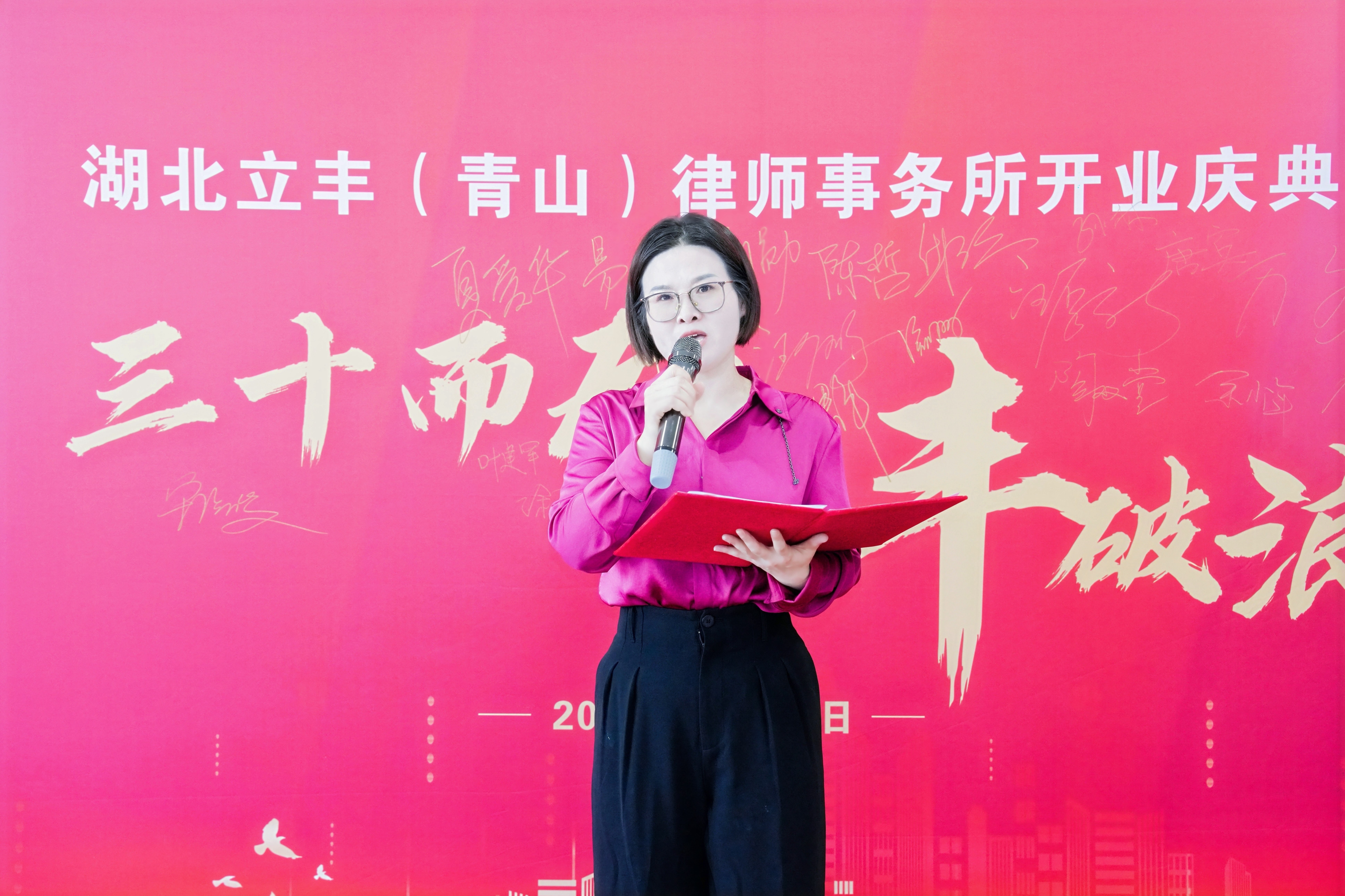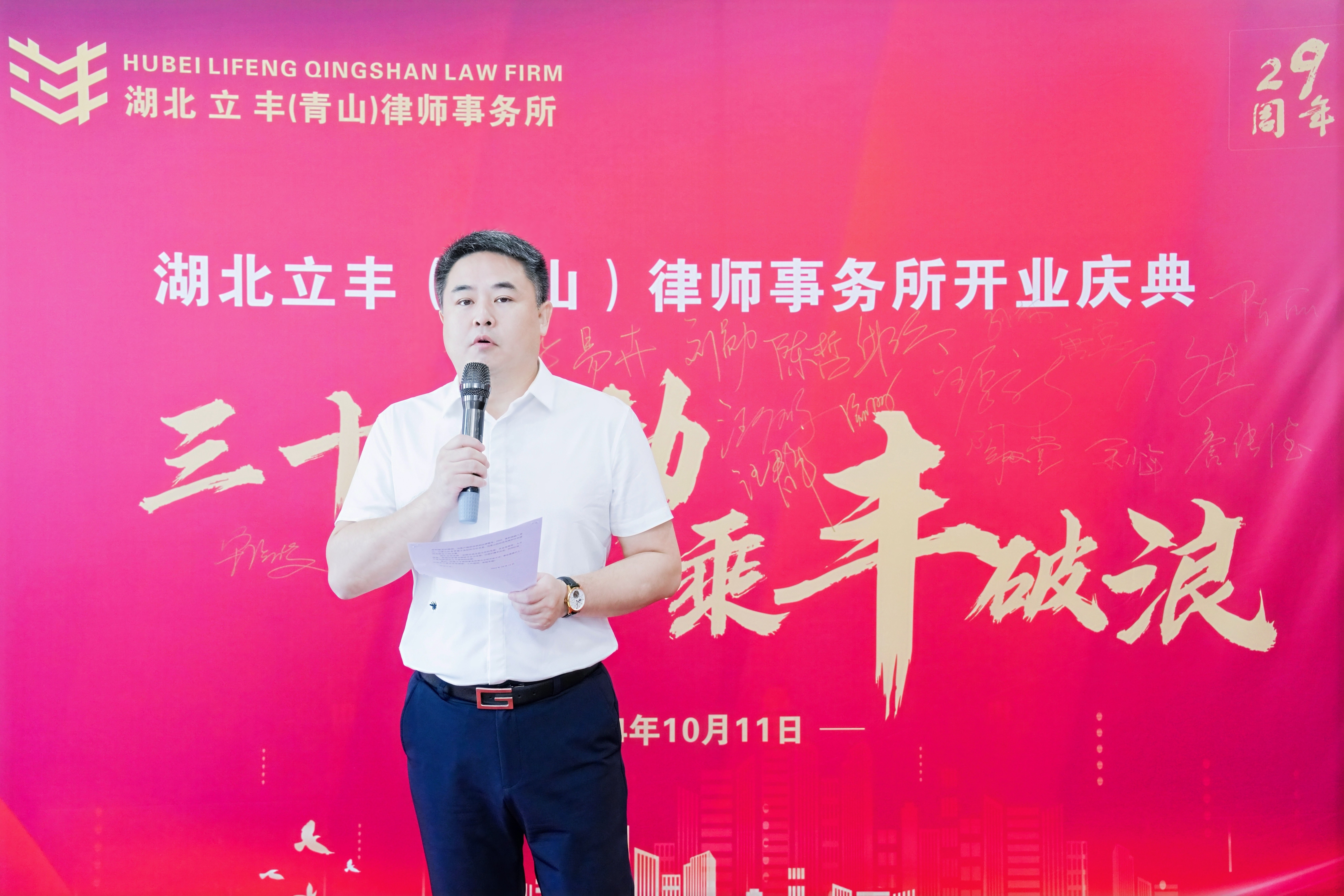 湖北省律師協(xié)會(huì)副會(huì)長(zhǎng)、湖北立豐律師事務(wù)所黨委書(shū)記、主任劉勛向蒞臨開(kāi)業(yè)典禮的各位貴賓表示熱烈歡迎和衷心的感謝。他表示,立豐所成立至今始終秉承“懷德而立,濟(jì)世則豐”的管理、建設(shè)與發(fā)展理念,踐行精神、價(jià)值與文化的傳承,在創(chuàng)始合伙人汪少鵬以及其他律師們的共同努力下,歷經(jīng)30年的發(fā)展,立豐所現(xiàn)已成為了一家集規(guī)范化、規(guī)?;I(yè)化、品牌化于一體,在湖北省內(nèi)外具有一定行業(yè)地位與社會(huì)影響度、較強(qiáng)競(jìng)爭(zhēng)優(yōu)勢(shì)和良好市場(chǎng)信譽(yù)的全國(guó)優(yōu)秀律師事務(wù)所。青山區(qū)作為武漢市中心城區(qū)之一,是“一五”計(jì)劃時(shí)期國(guó)家投資建設(shè)的新型工業(yè)基地,素有“十里鋼城”之美譽(yù)。立豐青山分所作為立豐所設(shè)立的第一家同城分所,是立豐所發(fā)展歷程中的一個(gè)重要里程碑,標(biāo)志著立豐所法律服務(wù)網(wǎng)絡(luò)進(jìn)一步的拓展,服務(wù)能力進(jìn)一步的提升。立豐青山分所的成立,不僅是立豐所業(yè)務(wù)的延伸,更是立豐所進(jìn)一步提升品牌影響力、拓展市場(chǎng)資源的重要發(fā)展戰(zhàn)略。希望立豐青山分所的同仁們能夠傳承立豐所的優(yōu)良傳統(tǒng),堅(jiān)守法律底線,秉持公正之心,以專業(yè)的素養(yǎng)和敬業(yè)的精神,積極融入青山,與青山區(qū)各界建立良好的合作關(guān)系,為青山的經(jīng)濟(jì)發(fā)展和法治建設(shè)貢獻(xiàn)自己的力量。