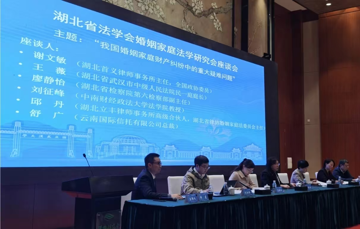 研討會(huì)正式開幕后,由全國政協(xié)委員、湖北首義律師事務(wù)所謝文敏主任、湖北省武漢市中級(jí)人民法院民一庭王薇庭長、湖北省檢察院第六檢察部廖靜怡副主任、中南財(cái)經(jīng)政法大學(xué)法學(xué)院劉征峰教授、立豐所律師邱丹、云南國際信托有限公司總裁舒廣就我國婚姻家庭財(cái)產(chǎn)糾紛中的重大疑難問題進(jìn)行座談,各位嘉賓結(jié)合即將出臺(tái)的《民法典婚姻家庭編司法解釋(二)》以及各自工作中的實(shí)踐經(jīng)驗(yàn)和研究成果發(fā)表真知灼見,觀點(diǎn)碰撞。