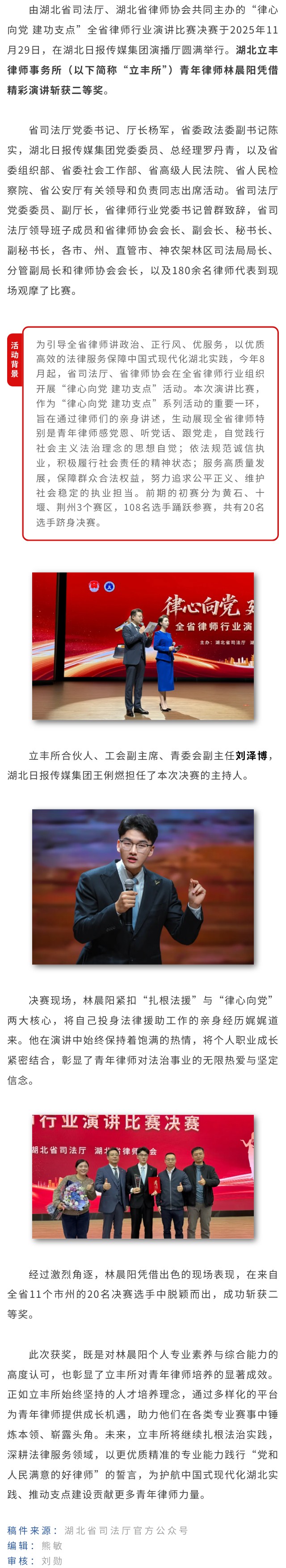 立豐所林晨陽在“律心向黨 建功支點”全省律師行業(yè)演講比賽決賽中斬獲二等獎